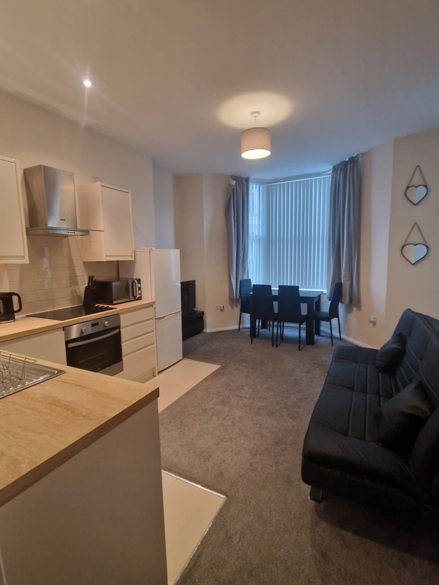 The flat features a light-filled open plan kitchen/diner, creating a contemporary and welcoming living space. The modern kitchen comes complete with an integrated oven and hob, offering both practicality and sleek design.